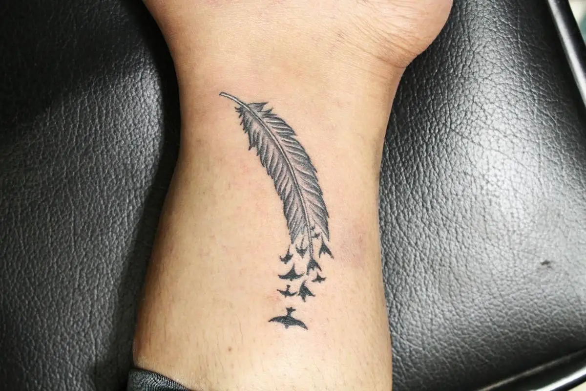Si quieres un tatuaje original, moderno y femenino no tendrás mejor opción que este diseño. Se trata de una pluma expuesta en tu antebrazo que además de dibujarla entre los contrastes del blanco y negro, de ella se desprenderán aves con sus alas abiertas.
