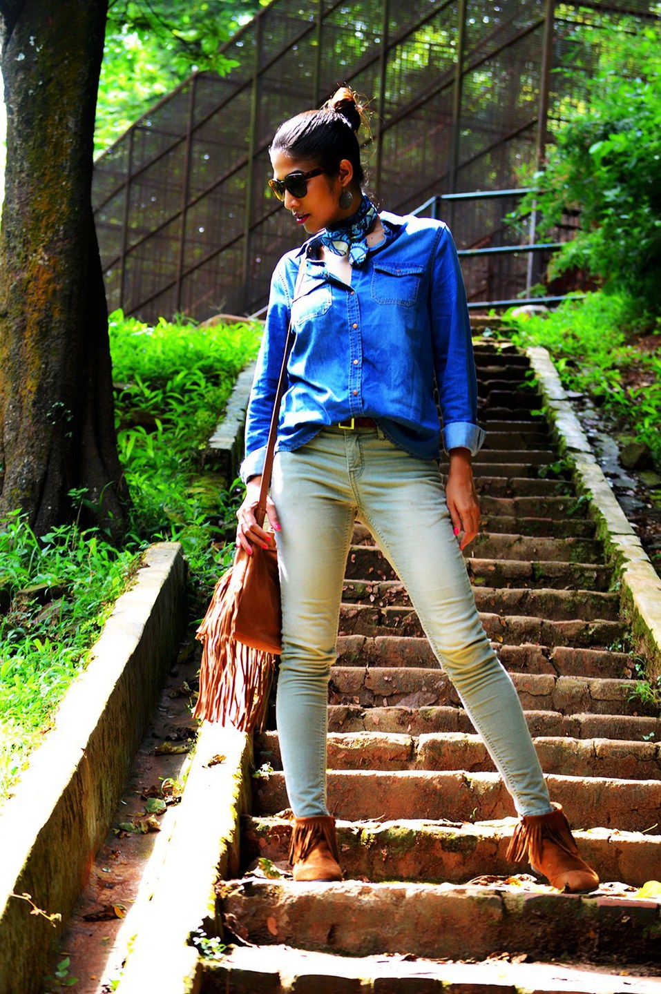 Si quieres lucir diferente, a la moda y con mucho estilo logra este look eligiendo una camisa de mezclilla, pantalón unicolor y un par de botines con flecos súper trendy.